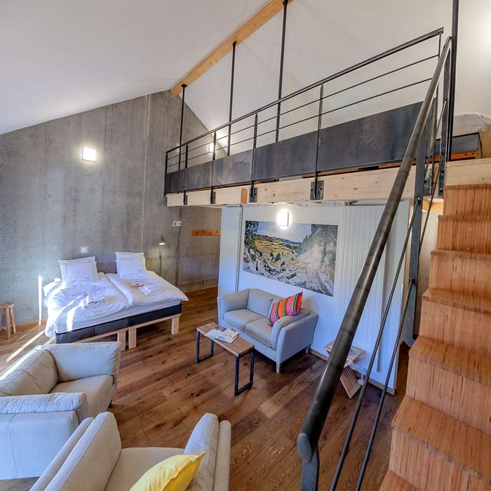 Dans notre suite familiale vous avez une grande chambre en bas et deux mezzanines avec lits. Salle de bain privative avec douche + baignoire et accès à la terrasse du niveau supérieur. Taille: 40m2 + 20m2 de mezzanine.